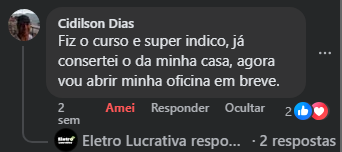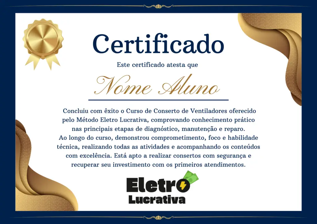 Ao concluir o curso ELETRO LUCRATIVA, você recebe um certificado digital de conclusão automaticamente, com seu nome, data e carga horária.